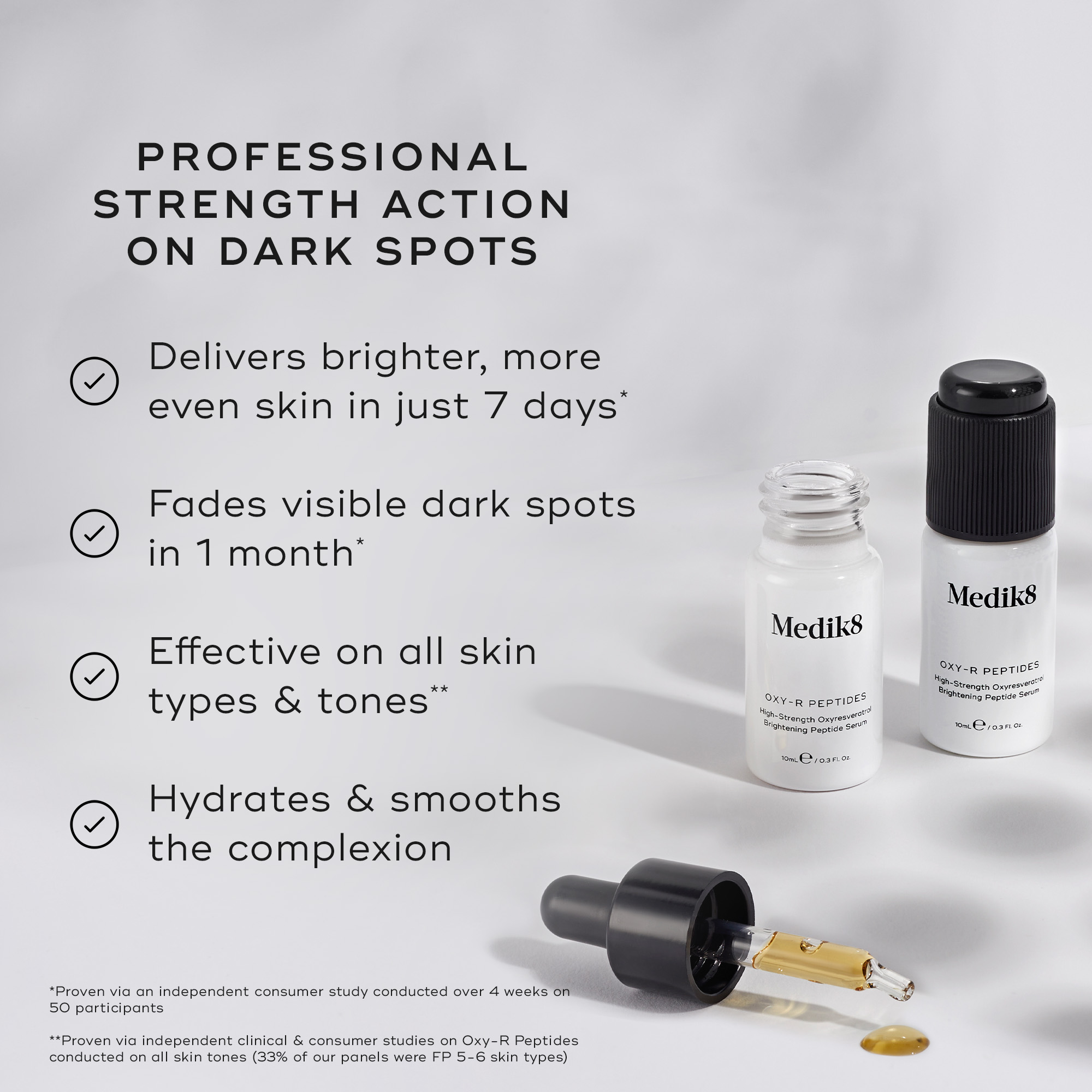 Διαθέσιμος μόνο από την Medik8, σε μια μέχρι πρότινος ανέφικτη συγκέντρωση, 1% οξυρεσβερατρόλης, το Oxy-R Peptides προσφέρει κλινικά αποδεδειγμένη δράση σε όλους τους τύπους δέρματος, για μια πιο φωτεινή και ομοιόμορφη επιδερμίδα, με λιγότερες σκούρες κηλίδες και σημάδια μεταφλεγμονώδους υπερμελάχρωσης.