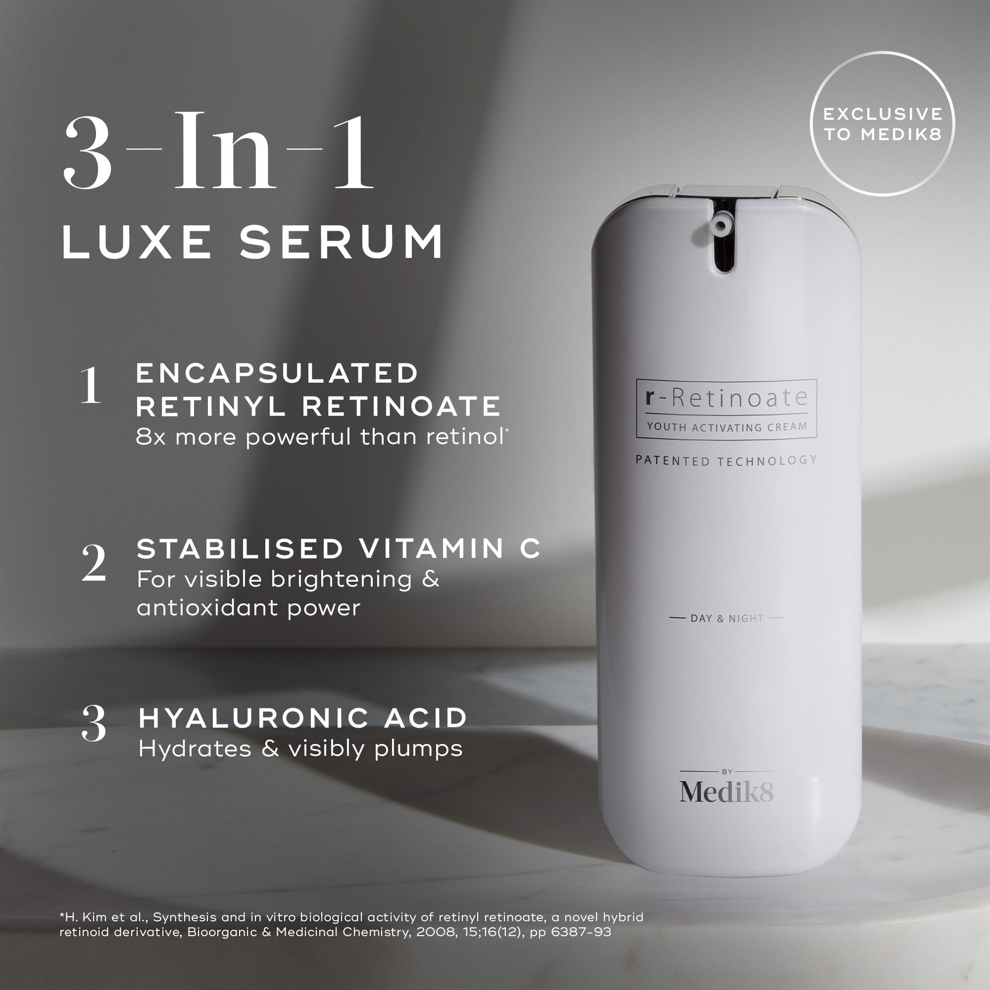 Μια φόρμουλα, με πολλαπλά οφέλη, που συνδυάζει το retinyl retinoate, με τη σταθεροποιημένη μορφή Βιταμίνης C και το υαλουρονικό οξύ, για ορατή βελτίωση του τόνου, της υφής και της φωτεινότητας του δέρματος.