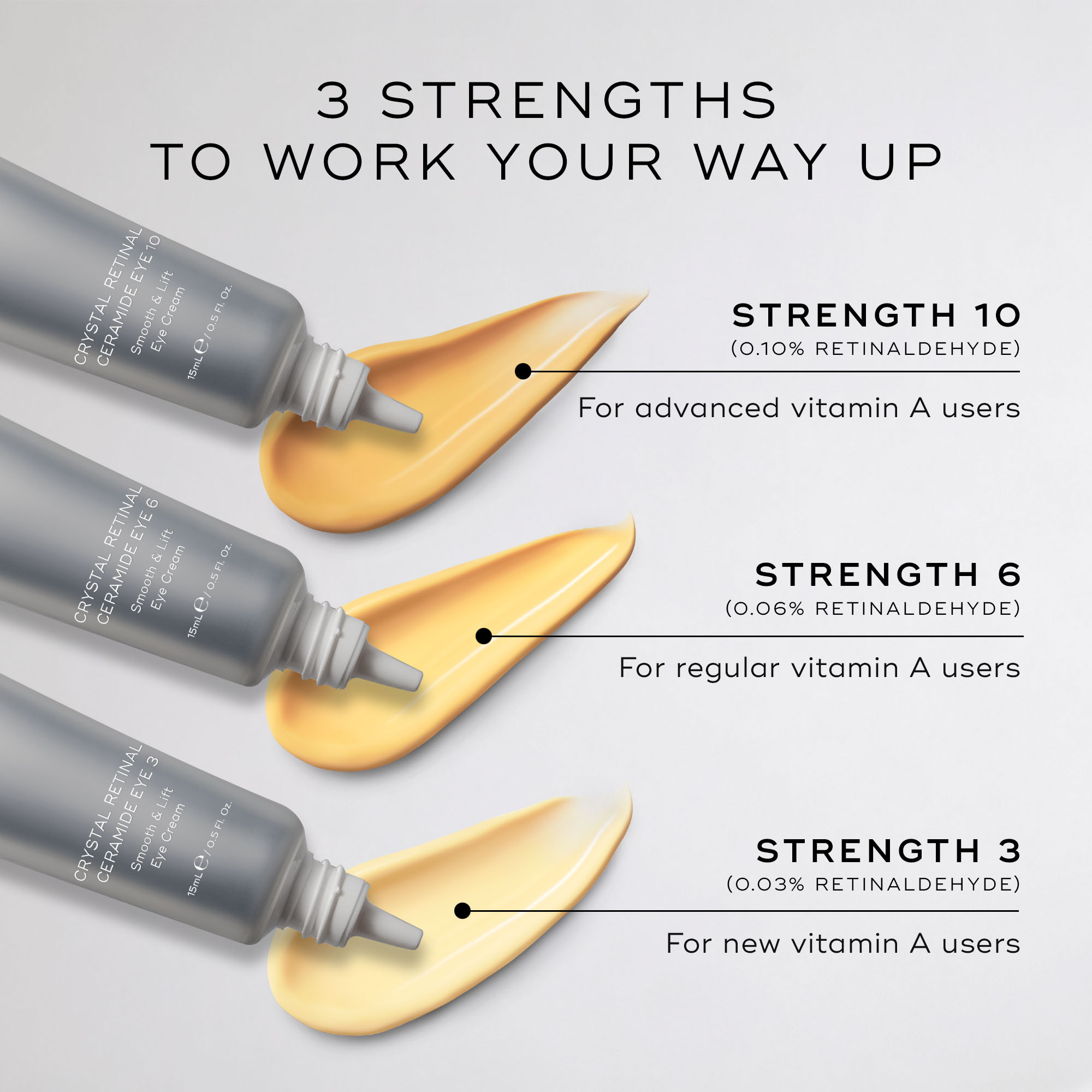 Ανακαλύψτε τη σταθεροποιημένη ρετιναλδεΰδη, βελτιστοποιημένη από ειδικούς για την περιοχή των ματιών και διαθέσιμη σε 3 εντάσεις για προοδευτικά ορατά αποτελέσματα που γίνονται πιο εμφανή με την πάροδο του χρόνου.